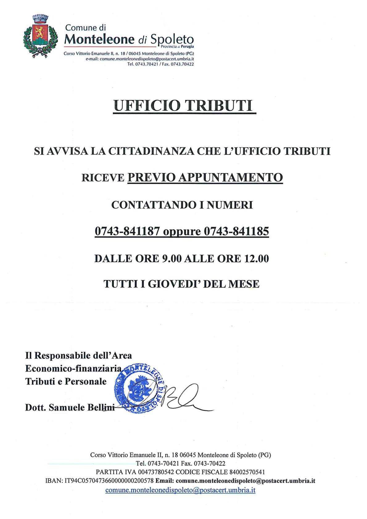SI AVVISA LA CITTADINANZA CHE L’UFFICIO TRIBUTI RICEVE PREVIO APPUNTAMENTO