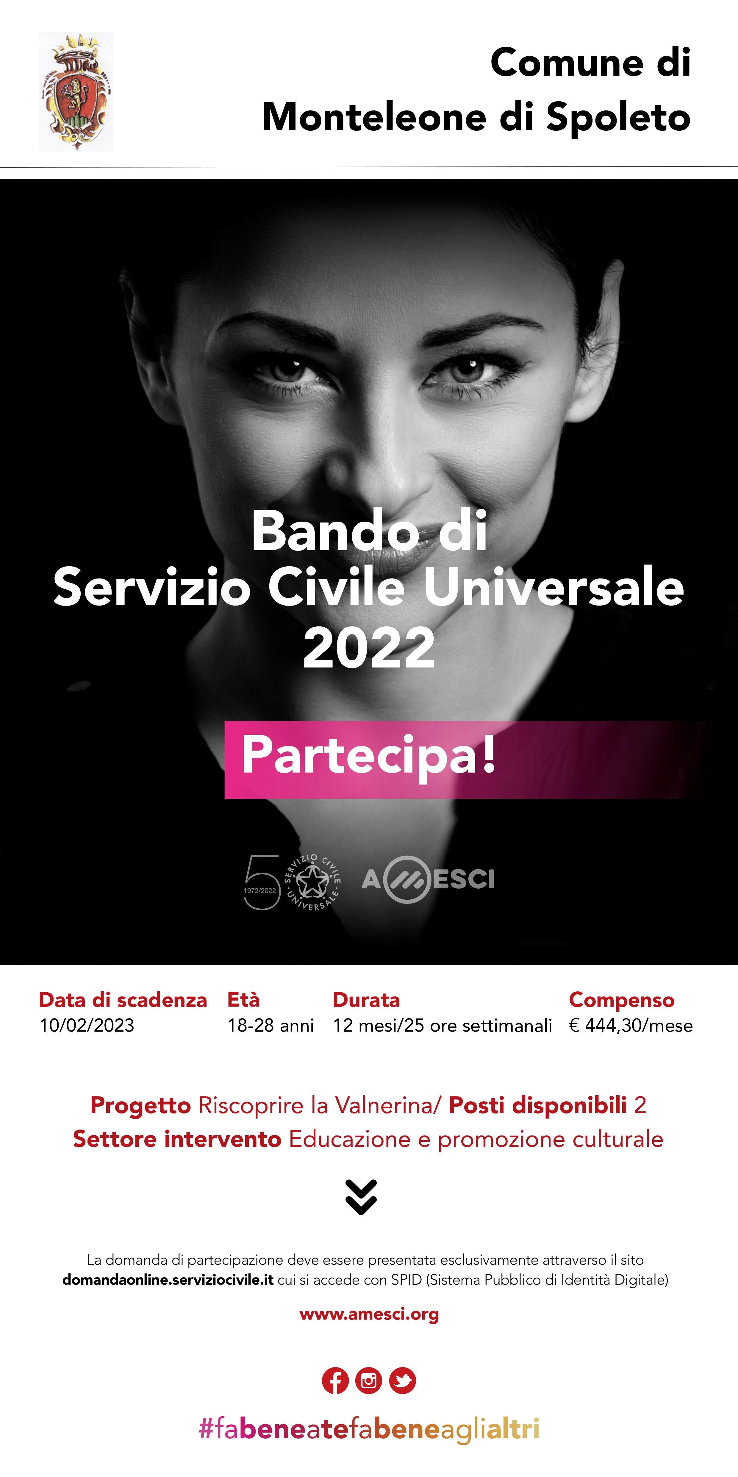 Per ulteriore supporto o informazione è possibile contattare i nostri uffici dal lunedì al venerdì, dalle 09:00 alle 13:30 e dalle 14:30 alle 18:00 allo 081.198.11.450, o scrivendo a serviziocivile@amesci.org.