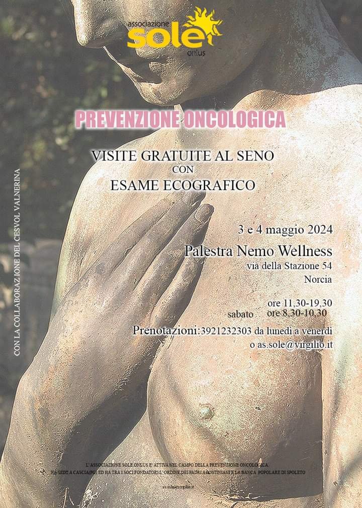 PREVENZIONE ONCOLOGICA - VISITE GRATUTIE AL SENO CON ESAME ECOGRAFICO - NORCIA 3 E 4 MAGGIO 2024